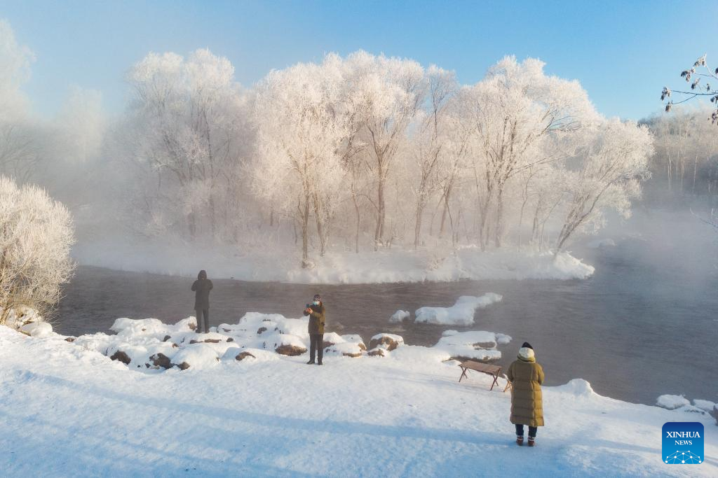 A drone photo taken on Feb. 2, 2024 shows tourists watching the rime scenery near Pingtai Village of Kelin Township, Xunke County, northeast China's Heilongjiang Province. (Xinhua/Xie Jianfei)