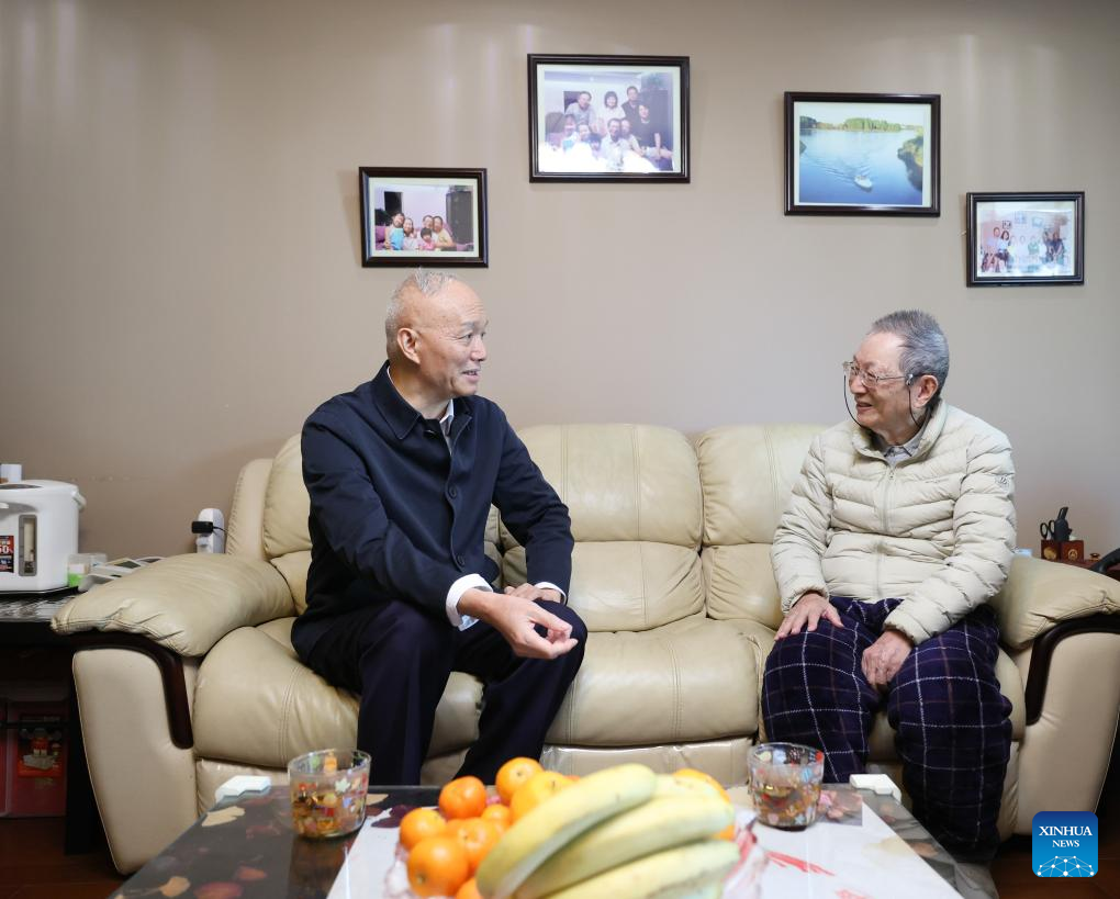 Cai Qi, a member of the Standing Committee of the Political Bureau of the Communist Party of China (CPC) Central Committee and a member of the Secretariat of the CPC Central Committee, visits radiochemist Wang Fangding on Feb. 7, 2024. On behalf of the CPC Central Committee and General Secretary Xi Jinping, Cai visited several prominent figures on Wednesday morning and extended festive greetings to all people working in the culture, science and technology circles for the upcoming Chinese Lunar New Year. (Xinhua/Ding Haitao)