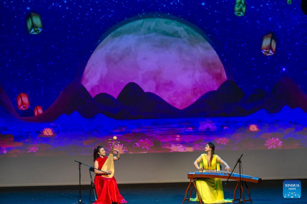 Performers are seen on the stage at the Municipal Theatre of Piraeus for the upcoming Chinese New Year in Piraeus, Greece, Feb. 6, 2024. (Xinhua/Marios Lolos)