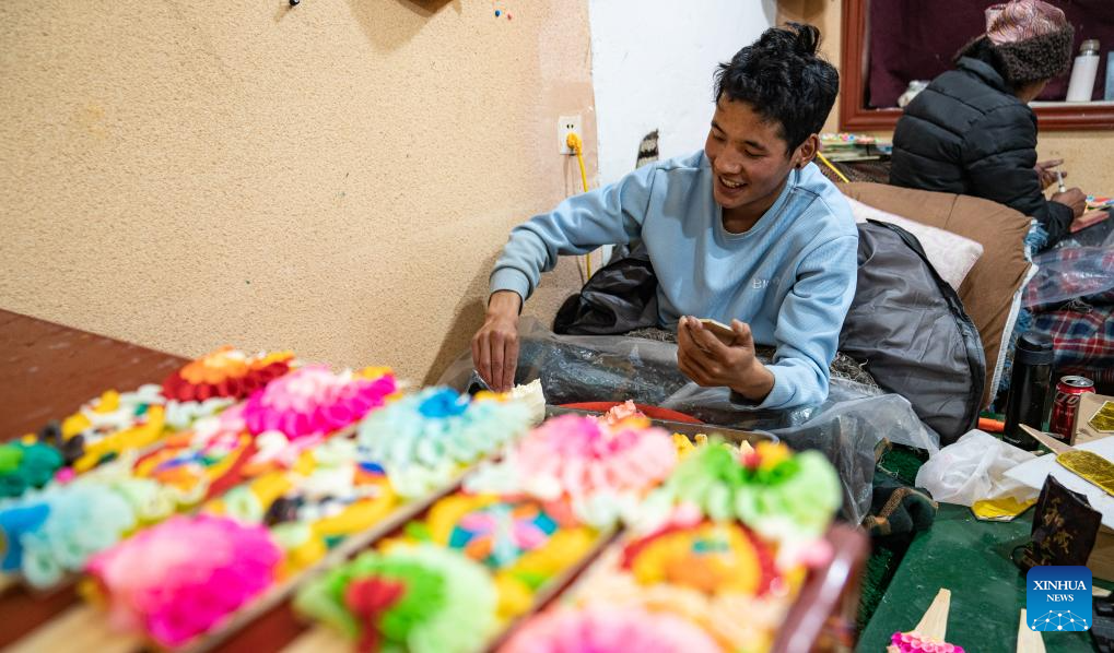 A craftsman makes butter sculptures in Lhasa, southwest China's Xizang Autonomous Region, Feb. 7, 2024. The Tibetan New Year coincides with the Lunar New Year, or the Spring Festival, which falls on Feb. 10 this year. As the New Year is approaching, butter sculptures handmade by local craftsmen sell quite well in Xizang. (Xinhua/Tenzin Nyida)