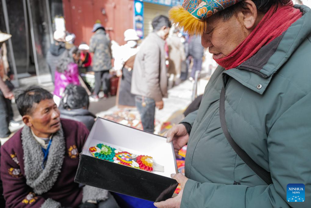A customer selects butter sculptures in Lhasa, southwest China's Xizang Autonomous Region, Feb. 7, 2024. The Tibetan New Year coincides with the Lunar New Year, or the Spring Festival, which falls on Feb. 10 this year. As the New Year is approaching, butter sculptures handmade by local craftsmen sell quite well in Xizang. (Xinhua/Sun Ruibo)