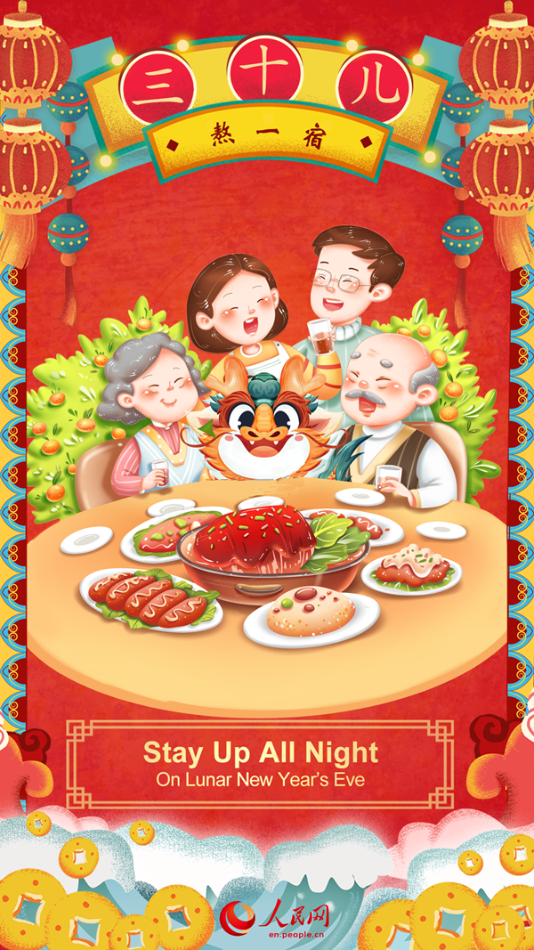 According to folklore, the reason why people stay up all night on Chinese New Year's Eve is that they have to try to drive away a monster called Nian (year). The monster was believed to hurt people in villages during the eve of the New Year.
