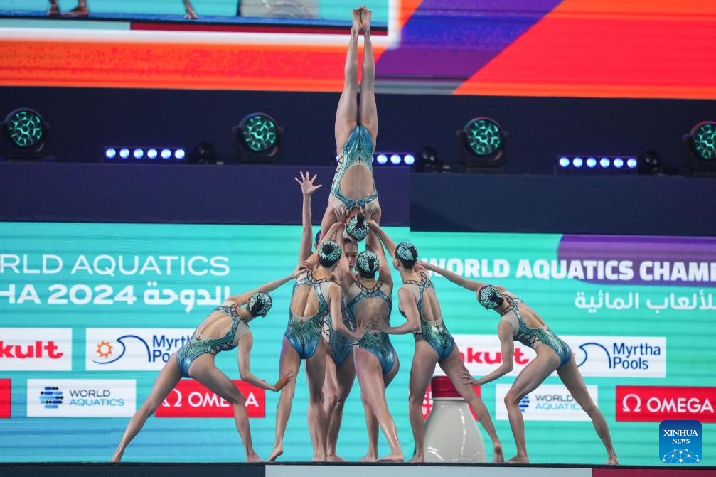 Team China perform during the final of team free of artistic swimming at the World Aquatics Championships in Doha, Qatar, Feb. 9, 2024. (Xinhua/Xue Yuge)