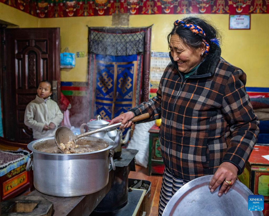 Sichod Wangmo has "gutu" at home in Damxung County, southwest China's Xizang Autonomous Region, Feb. 8, 2024.