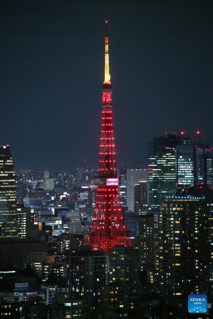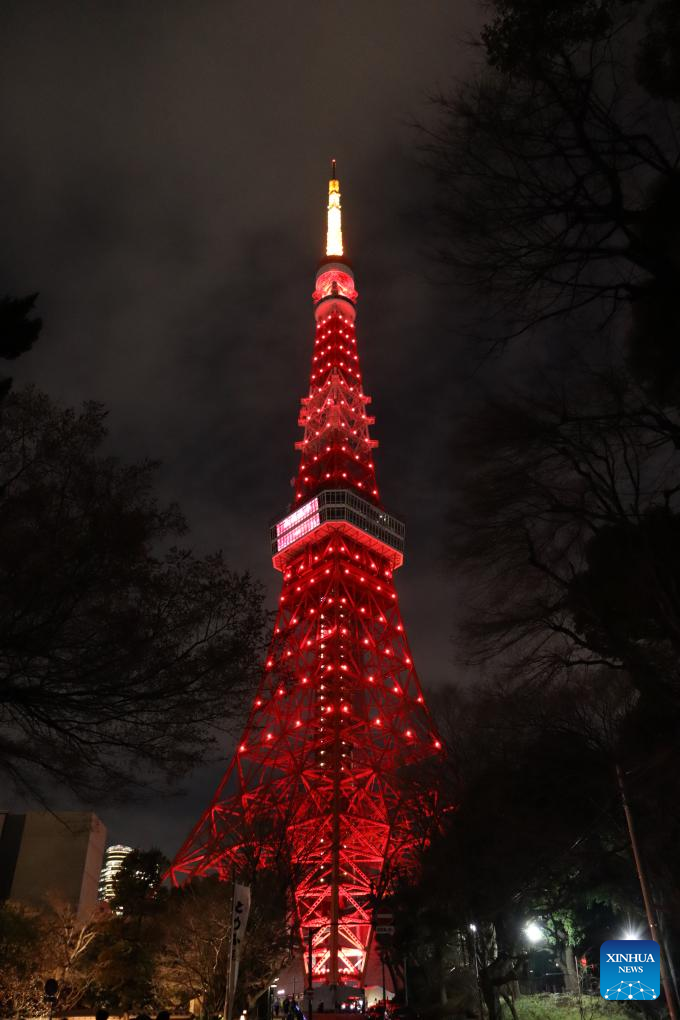 TOKYO, Feb. 9 (Xinhua) -- Japan's iconic landmark Tokyo Tower was illuminated in red on Friday to celebrate the Chinese Lunar New Year, an annual event that has been running since 2019 to promote cultural exchanges.