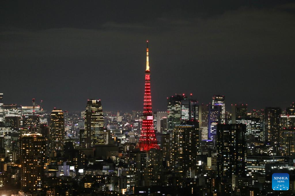 Tokyo Tower is lit up in red to celebrate the upcoming Chinese Lunar New Year, or Spring Festival, in Tokyo, Japan, Feb. 9, 2024. (Xinhua/Yue Chenxing)