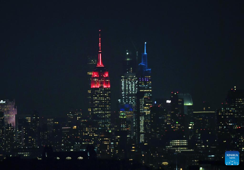 This photo taken on Feb. 8, 2024 shows the Empire State Building lit up in red for the Chinese Lunar New Year in New York, the United States. (Xinhua/Li Rui)