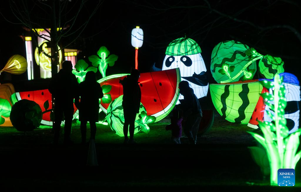 People look at light installations during a lantern show in Markham, Ontario, Canada, on Feb. 8, 2024. This event, featuring over 250 colorful silk lanterns, is held here from Feb. 8 to 25 to celebrate the Chinese Lunar New Year, which falls on Saturday. (Photo by Zou Zheng/Xinhua)