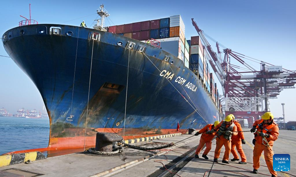 An aerial drone photo shows a cargo ship docking at Qingdao Port, east China's Shandong Province, Feb. 11, 2024. The Qingdao port is busy handling goods for export during the Spring Festival holiday. (Xinhua/Li Ziheng)