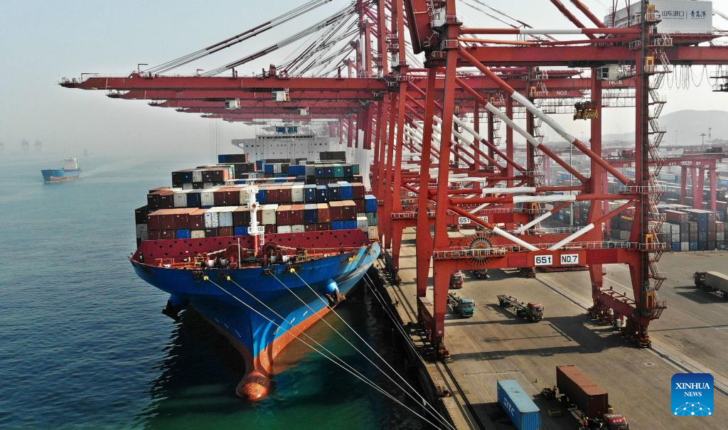 An aerial drone photo shows the Qingdao Port in east China's Shandong Province, Feb. 11, 2024. The Qingdao port is busy handling goods for export during the Spring Festival holiday. (Xinhua/Li Ziheng)
