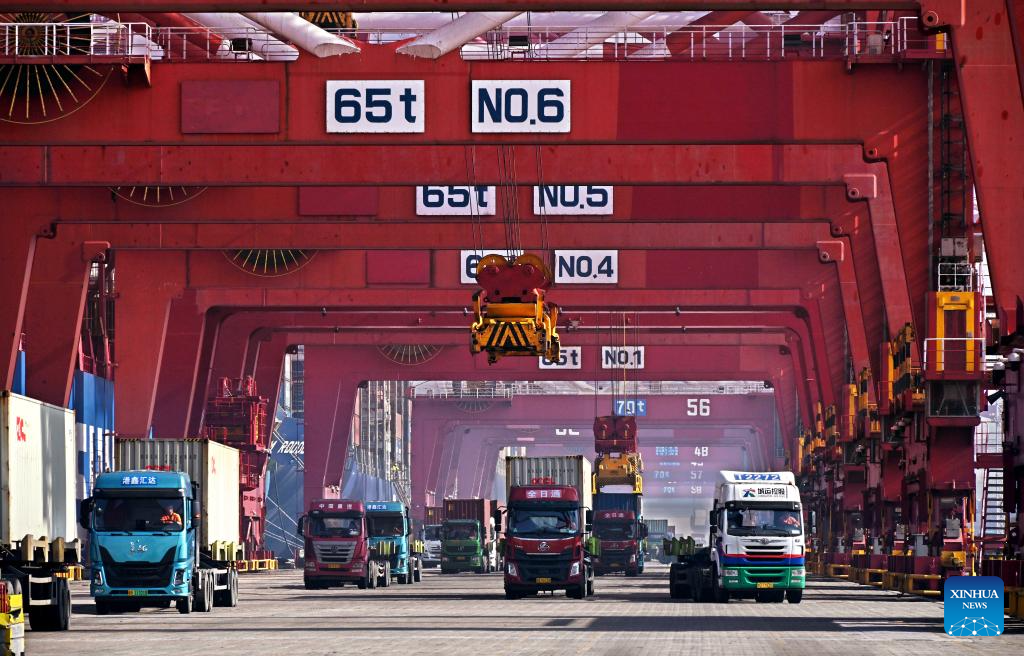 Trucks transport containers at Qingdao Port, east China's Shandong Province, Feb. 11, 2024. The Qingdao port is busy handling goods for export during the Spring Festival holiday. (Xinhua/Li Ziheng)