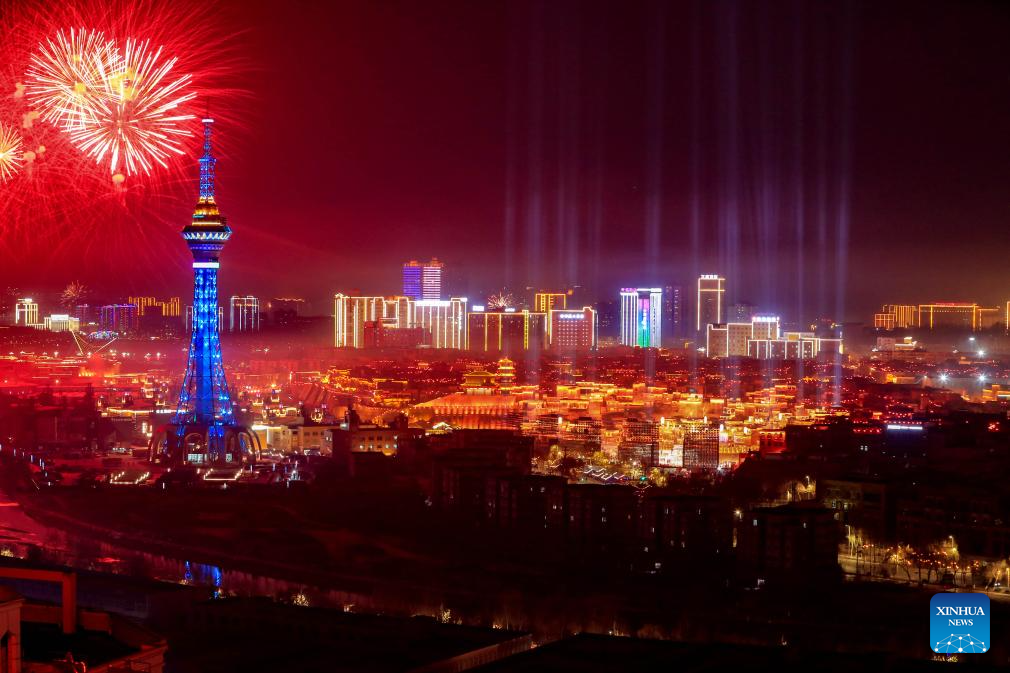 This photo taken on Feb. 9, 2024 shows a night view in Kashgar, northwest China's Xinjiang Uygur Autonomous Region. Kashgar has been meticulously decorated to celebrate the Spring Festival. The ancient city of Kashgar is a branch venue of this year's China Central Television (CCTV) Spring Festival Gala. (Photo by Cai Zengle/Xinhua)