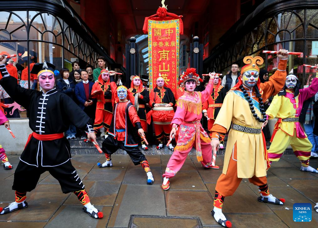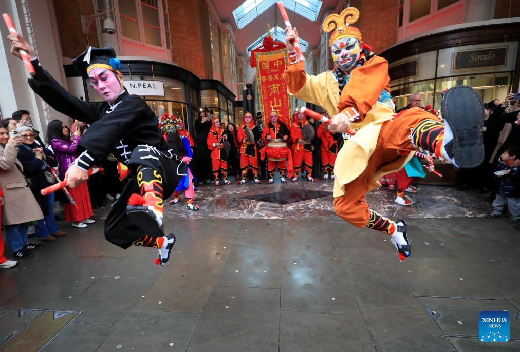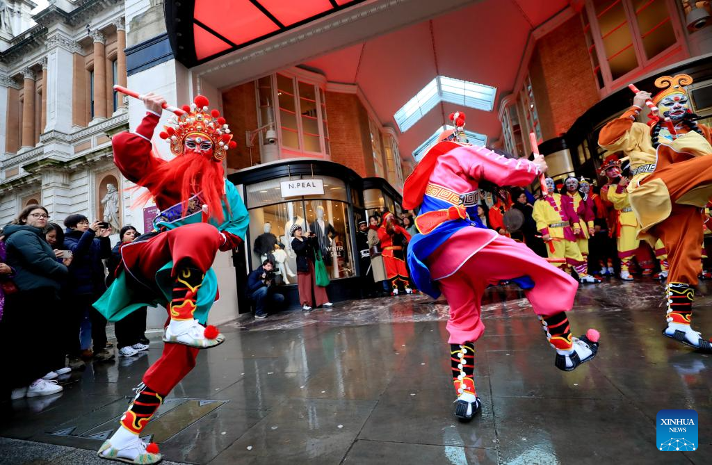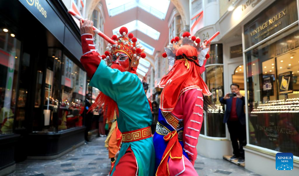 Artists perform Yingge Dance, a form of folk dance popular in south China's Guangdong Province, at Burlington Arcade in London, Britain, Feb. 10, 2024. (Xinhua/Li Ying)