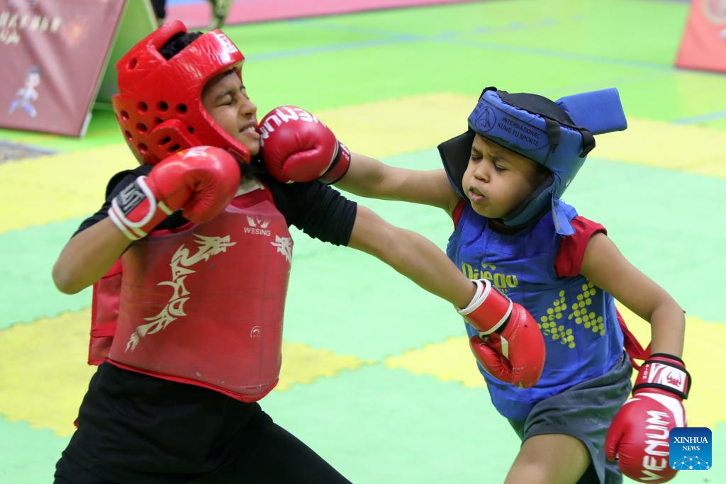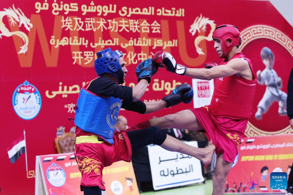 Egyptian athletes compete during the opening of the Chinese Spring Festival Wushu Championship in Cairo, Egypt, on Feb. 11, 2024. (Xinhua/Ahmed Gomaa)