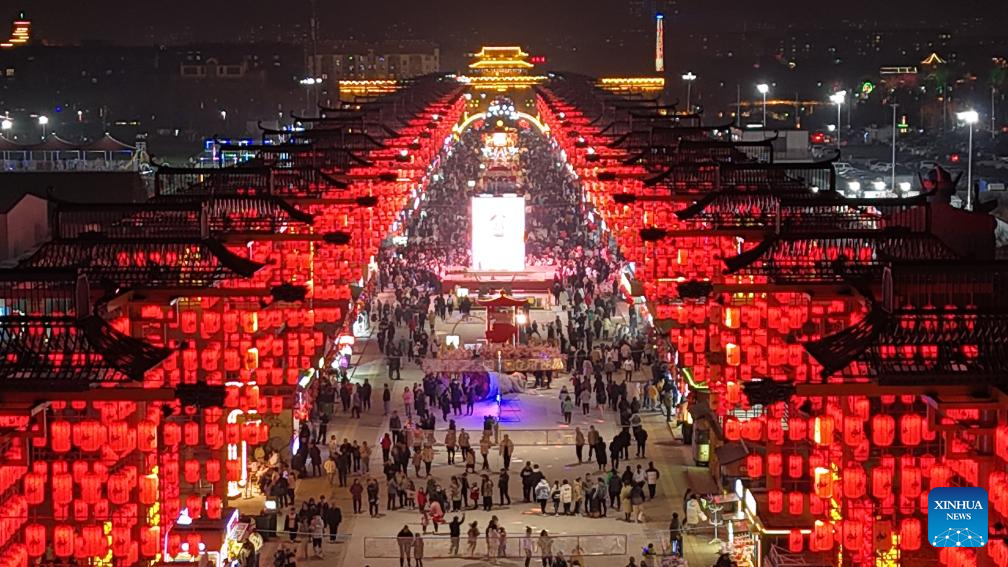An aerial drone photo taken on Feb. 11, 2024 shows tourists visiting a scenic area in Huimin County of Binzhou City, east China's Shandong Province. People across China are enjoying the ongoing Spring Festival holiday in various ways. (Photo by Chu Baorui/Xinhua)