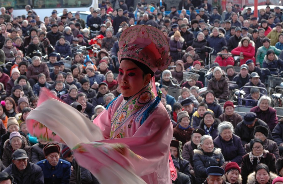 An actor gives a local opera performance in Shedian Town in Sheqi County, central China's Henan Province during the Spring Festival of 2011.