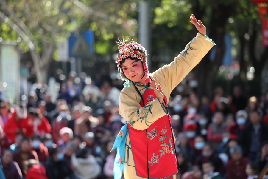 An actor gives an opera performance in Zixing City, central China's Hunan Province during the Spring Festival of 2023.