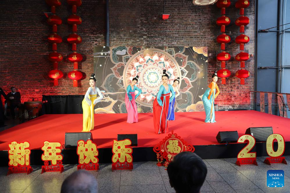Artists perform a traditional dance during a celebration of Chinese Spring Festival at the Irish Emigration Museum in Dublin, Ireland, on Feb. 15, 2024. On Thursday, a performance staged at the Irish Emigration Museum in Dublin, featuring Peking opera, martial arts, as well as traditional music and dance. (Xinhua)