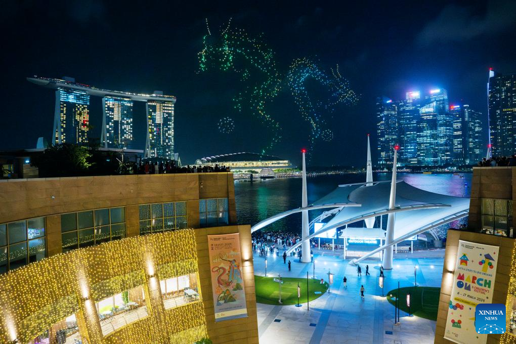 People watch a drone fleet performance celebrating the Year of the Dragon at Singapore's Marina Bay on Feb. 15, 2024. (Photo by Then Chih Wey/Xinhua)