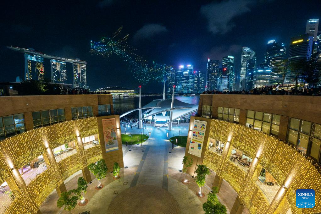 People watch a drone fleet performance celebrating the Year of the Dragon at Singapore's Marina Bay on Feb. 15, 2024. (Photo by Then Chih Wey/Xinhua)