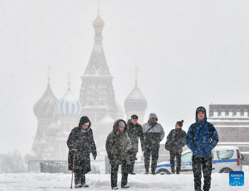 People walk at Red Square amid snowfall in Moscow, Russia, Feb. 15, 2024. A heavy snow hit Moscow on Thursday. (Xinhua/Cao Yang)