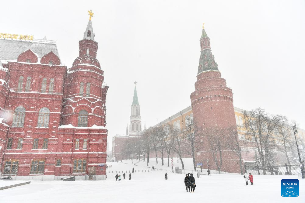This photo taken on Feb. 15, 2024 shows a view of Red Square amid snowfall in Moscow, Russia. A heavy snow hit Moscow on Thursday. (Xinhua/Cao Yang)
