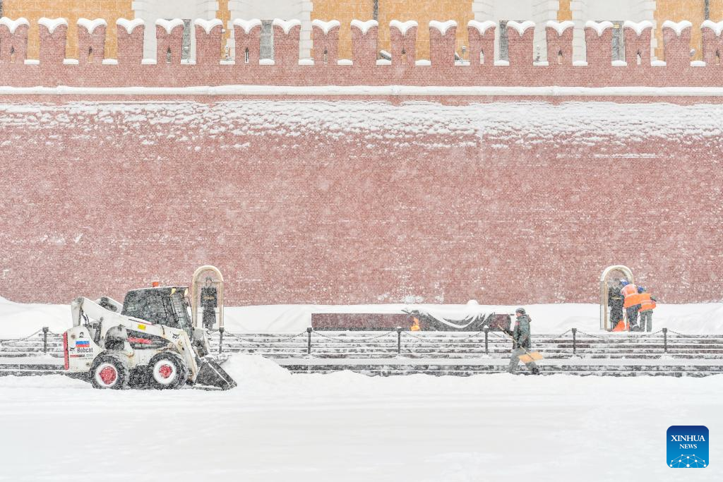 Workers clear snow off a street in Moscow, Russia, Feb. 15, 2024. A heavy snow hit Moscow on Thursday. (Xinhua/Cao Yang)
