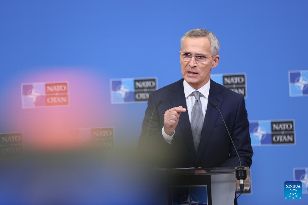 NATO Secretary General Jens Stoltenberg attends a press conference during a meeting of NATO defense ministers at the NATO headquarters in Brussels, Belgium, on Feb. 15, 2024. The North Atlantic Treaty Organization (NATO) sought to further strengthen the bloc's deterrence and defence, and support to Ukraine, at its defence ministers meeting here on Thursday. (Xinhua/Zhao Dingzhe)
