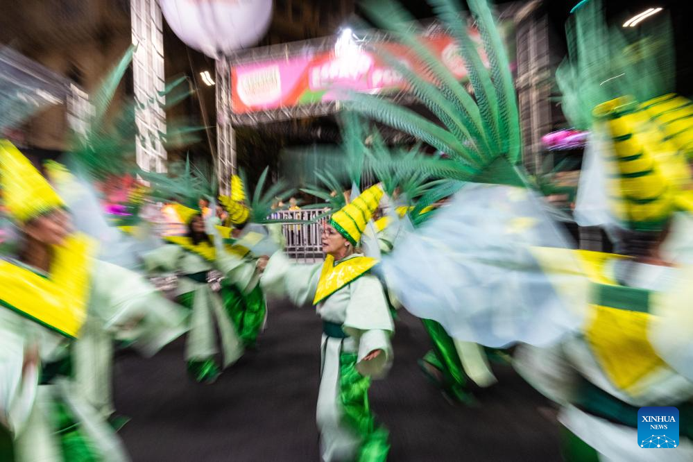 Members of Cidade Jardim Samba School participate in a carnival in Belo Horizonte, Brazil, Feb. 14, 2024. The school members staged performances at the event to celebrate the 50th anniversary of the establishment of diplomatic relations between China and Brazil and the Chinese Lunar New Year. (Xinhua/Wang Tiancong)