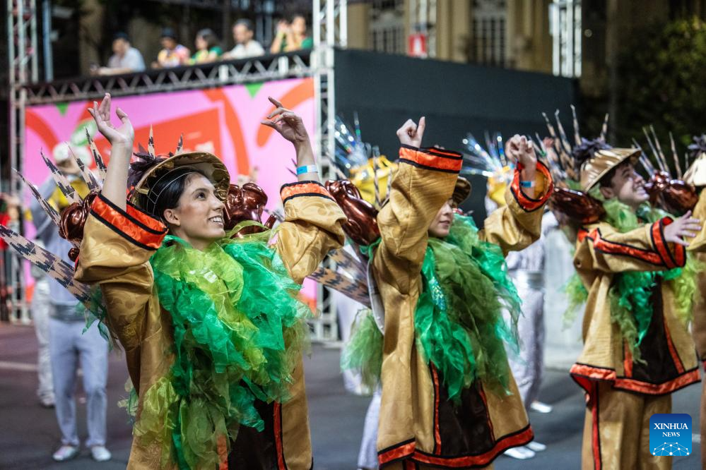 Members of Cidade Jardim Samba School participate in a carnival in Belo Horizonte, Brazil, Feb. 14, 2024. The school members staged performances at the event to celebrate the 50th anniversary of the establishment of diplomatic relations between China and Brazil and the Chinese Lunar New Year. (Xinhua/Wang Tiancong)