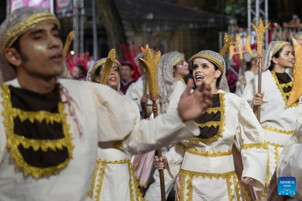 Members of Cidade Jardim Samba School participate in a carnival in Belo Horizonte, Brazil, Feb. 14, 2024. The school members staged performances at the event to celebrate the 50th anniversary of the establishment of diplomatic relations between China and Brazil and the Chinese Lunar New Year. (Xinhua/Wang Tiancong)