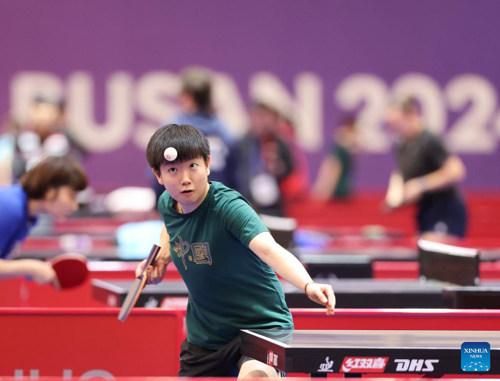 Team China's player Sun Yingsha attends a training session ahead of the ITTF World Team Table Tennis Championships Finals 2024 in Busan, South Korea, Feb. 15, 2024. The event will be staged here from Feb. 16 to 25. (Xinhua/Yao Qilin)