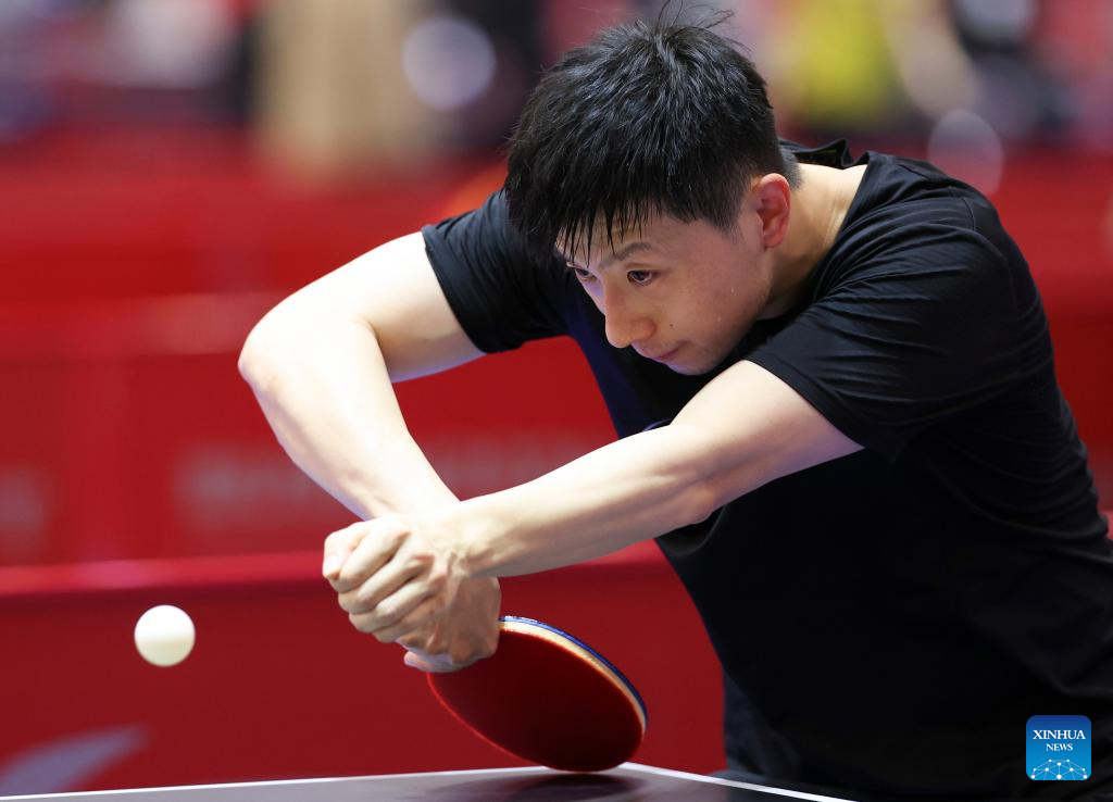 Team China's player Ma Long attends a training session ahead of the ITTF World Team Table Tennis Championships Finals 2024 in Busan, South Korea, Feb. 15, 2024. The event will be staged here from Feb. 16 to 25. (Xinhua/Yao Qilin)