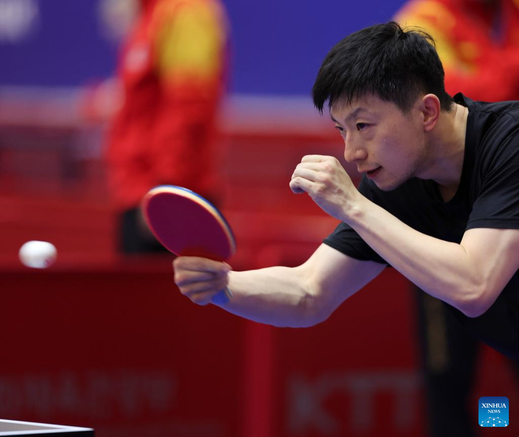 Team China's player Ma Long attends a training session ahead of the ITTF World Team Table Tennis Championships Finals 2024 in Busan, South Korea, Feb. 15, 2024. The event will be staged here from Feb. 16 to 25. (Xinhua/Yao Qilin)