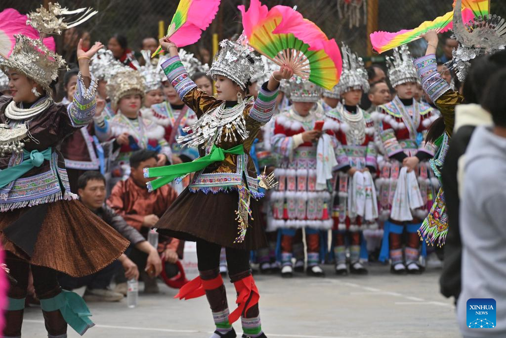 People perform dance of Miao ethnic group during an event celebrating the Spring Festival in Gandong Township, Rongshui Miao Autonomous County, south China's Guangxi Zhuang Autonomous Region, Feb. 14, 2024. People across China are enjoying the ongoing Spring Festival holiday in various ways. (Xinhua/Huang Xiaobang)