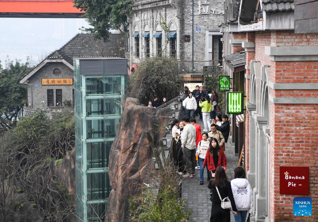 Tourists visit an ancient street in Chongqing, southwest China, Feb. 14, 2024. More Chinese people nowadays choose to go on a journey during the Spring Festival to experience different cultures and lunar new year atmosphere. (Xinhua/Wang Quanchao)