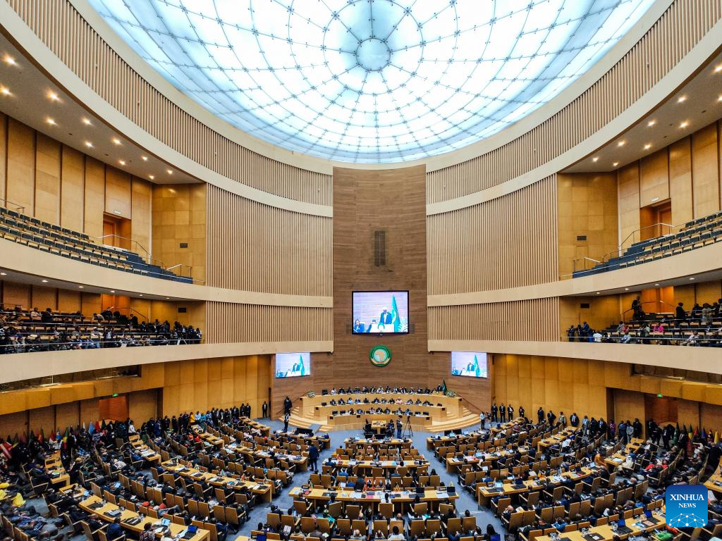 This photo taken on Feb. 17, 2024 shows a view of the 37th Ordinary Session of the African Union (AU) Assembly of the Heads of State and Government in Addis Ababa, Ethiopia. The 37th Ordinary Session of the AU Assembly of the Heads of State and Government opened on Saturday at the AU headquarters in Addis Ababa, the capital of Ethiopia. (Xinhua/Li Yahui)