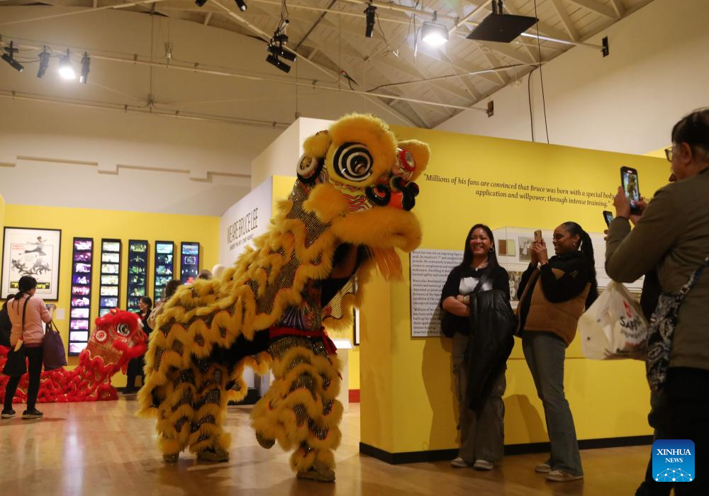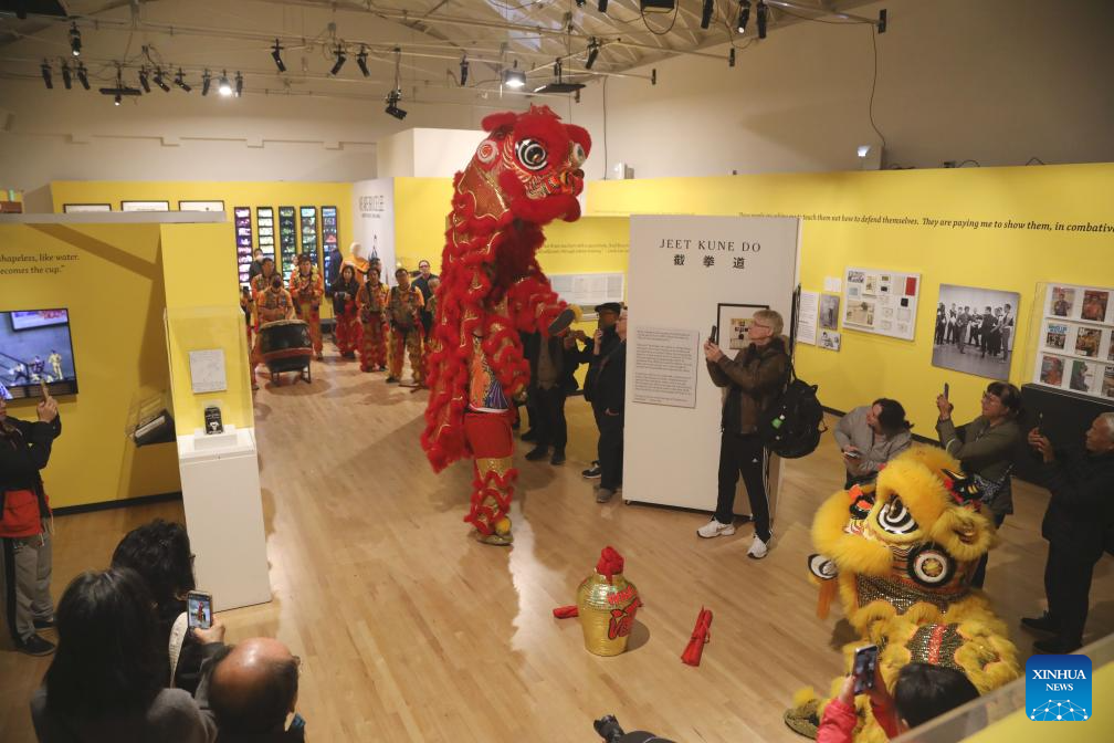 People watch a lion dance performance at the Chinese Historical Society of America Museum at the Chinatown in San Francisco, the United States, Feb. 16, 2024. A three-day event celebrating the Chinese Lunar New Year kicked off here on Friday. (Photo by Liu Yilin/Xinhua)