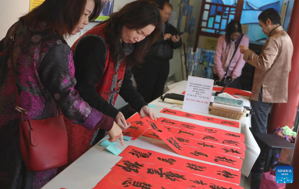 People select couplets at the Chinese Historical Society of America Museum at the Chinatown in San Francisco, the United States, Feb. 16, 2024. A three-day event celebrating the Chinese Lunar New Year kicked off here on Friday. (Photo by Liu Yilin/Xinhua)