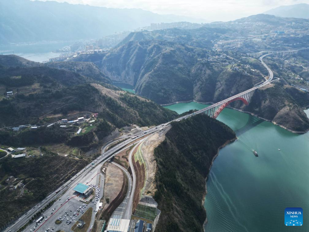 An aerial drone photo taken on Feb. 16, 2024 shows vehicles running on the Daning River grand bridge in Wushan County, southwest China's Chongqing Municipality. China witnessed an increase of passenger trips as this year's Spring Festival holiday is coming to an end. (Photo by Wang Zhonghu/Xinhua)