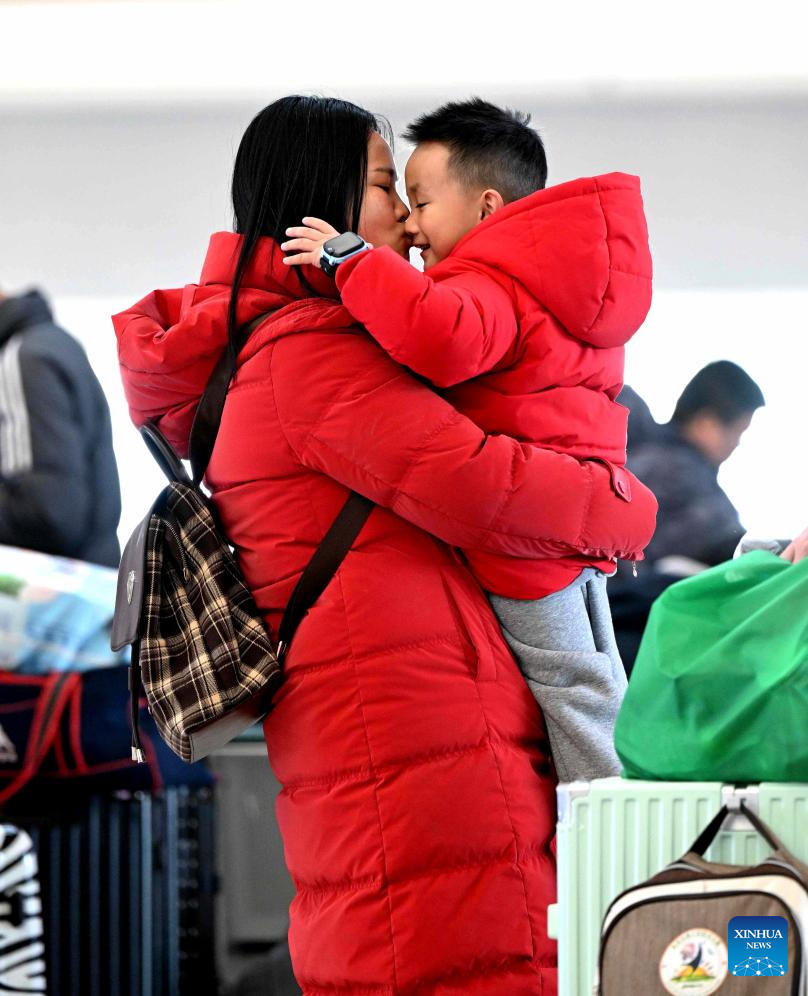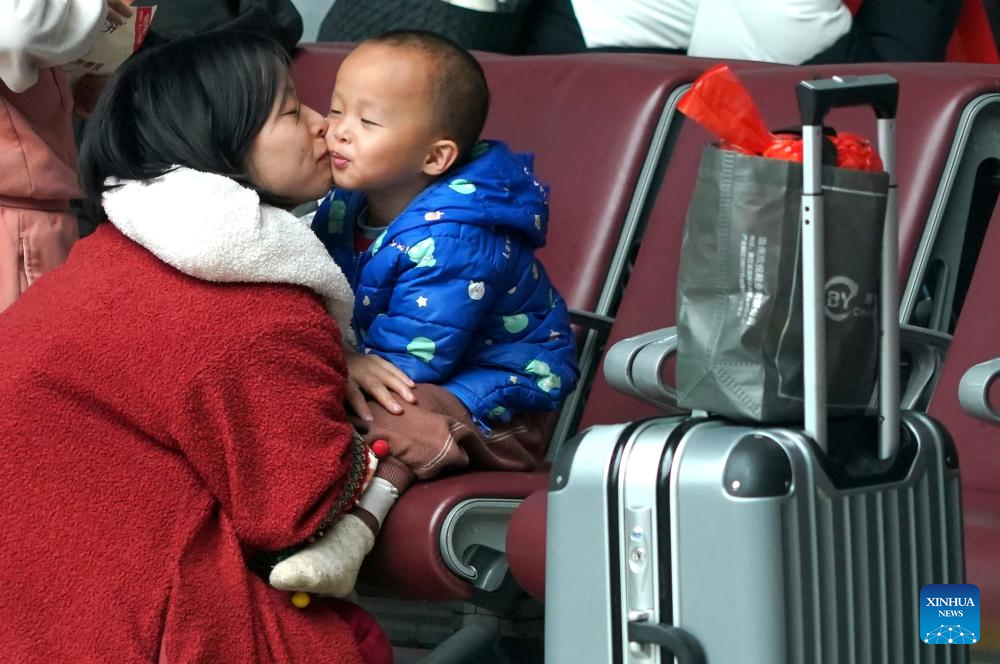 A woman kisses her kid at the waiting hall of Zhengzhou East Railway Station in Zhengzhou, central China's Henan Province, Feb. 17, 2024. China witnessed an increase of passenger trips on the last day of the eight-day Spring Festival holiday. (Xinhua/Li An)