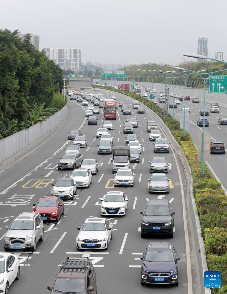 Vehicles move on the expressway surrounding the city of Guangzhou, south China's Guangdong Province, Feb. 17, 2024. China witnessed an increase of passenger trips on the last day of the eight-day Spring Festival holiday. (Xinhua/Lu Hanxin)