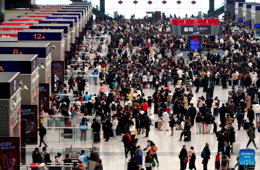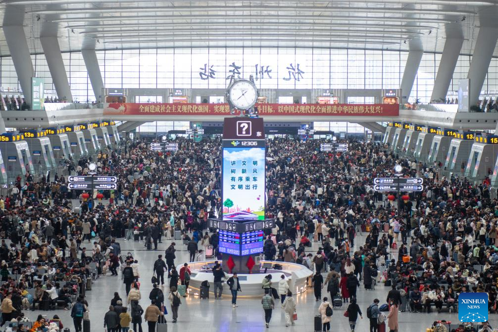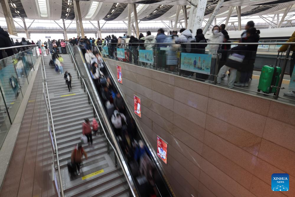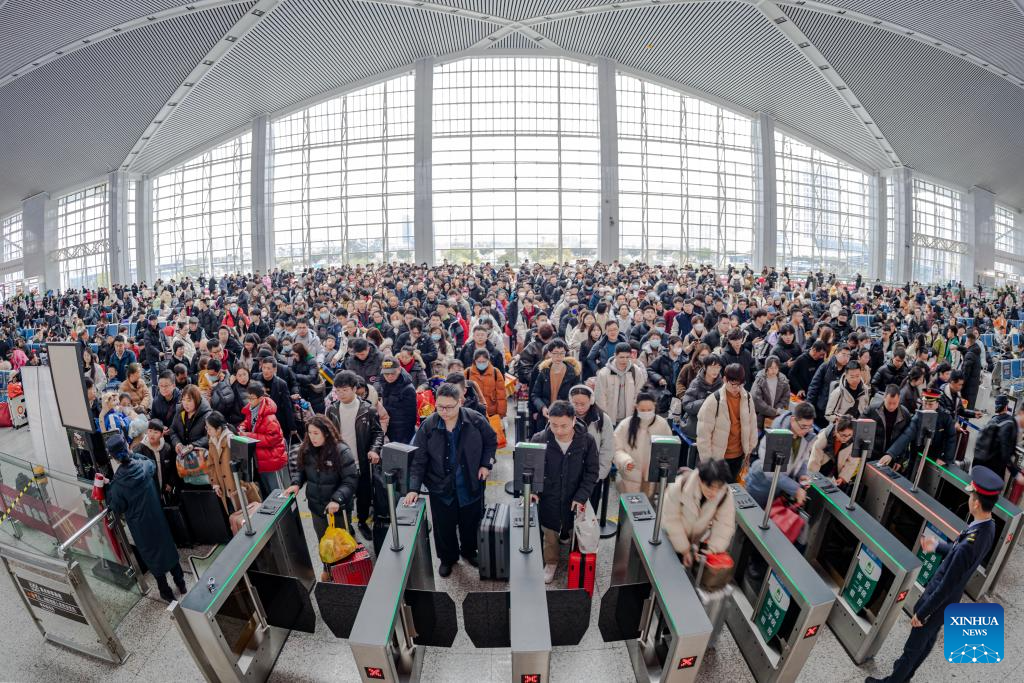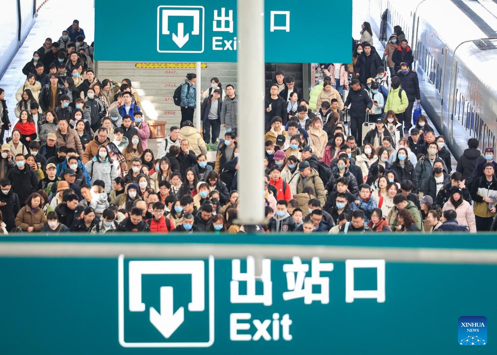 Travelers arrive at Nanjing Railway Station in Nanjing, east China's Jiangsu Province, Feb. 16, 2024. China witnessed an increase of passenger trips as this year's Spring Festival holiday is coming to an end. (Photo by Yang Suping/Xinhua)
