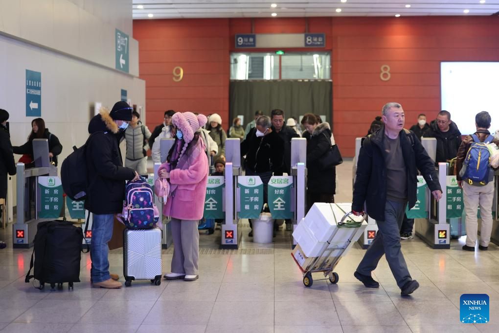 Passengers arrive at Beijing South Railway Station in Beijing, capital of China, Feb. 17, 2024. China witnessed an increase of passenger trips on the last day of the eight-day Spring Festival holiday. (Xinhua/Xing Guangli)