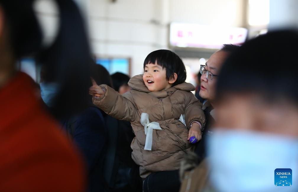 A child waits to get on a train at Tengzhou Railway Station in Tengzhou, east China's Shandong Province, Feb. 16, 2024. China witnessed an increase of passenger trips as this year's Spring Festival holiday is coming to an end. (Photo by Li Zhijun/Xinhua)