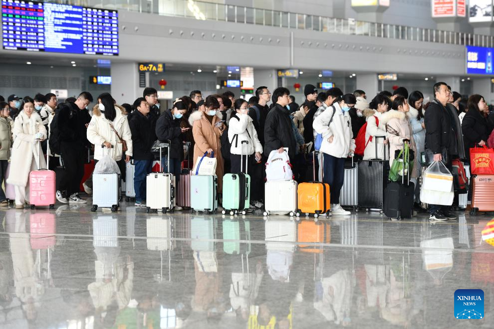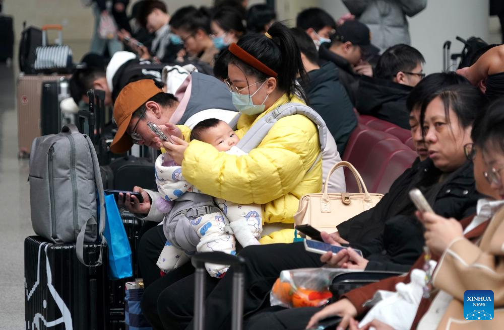 Passengers are pictured at the waiting hall of Zhengzhou East Railway Station in Zhengzhou, central China's Henan Province, Feb. 17, 2024. China witnessed an increase of passenger trips on the last day of the eight-day Spring Festival holiday. (Xinhua/Li An)