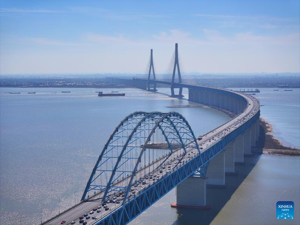 An aerial drone photo taken on Feb. 16, 2024 shows vehicles running on a road-rail bridge, which connects Suzhou and Nantong of Jiangsu Province with Shanghai, over the Yangtze River in Nantong, east China's Jiangsu Province. China witnessed an increase of passenger trips as this year's Spring Festival holiday is coming to an end. (Photo by Xu Congjun/Xinhua)