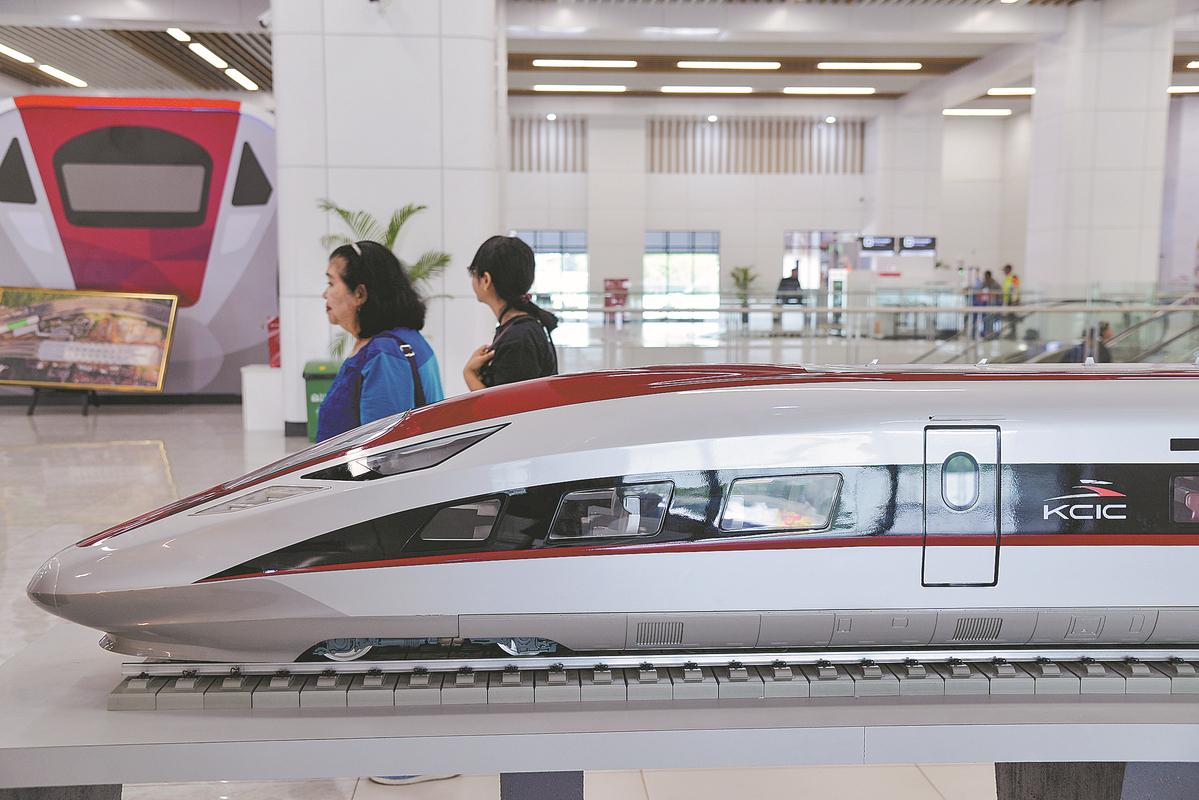 Passengers in Jakarta, Indonesia, walk past a model of high-speed trains used on the Jakarta-Bandung Railway. FANG ZHE/ XINHUA