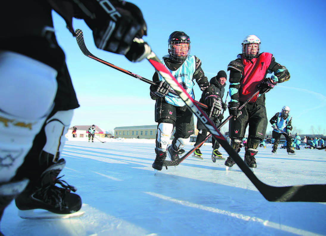 The hockey team of Shuixigou Middle School has a training session on Dec 20, 2023. WANG JING/CHINA DAILY
