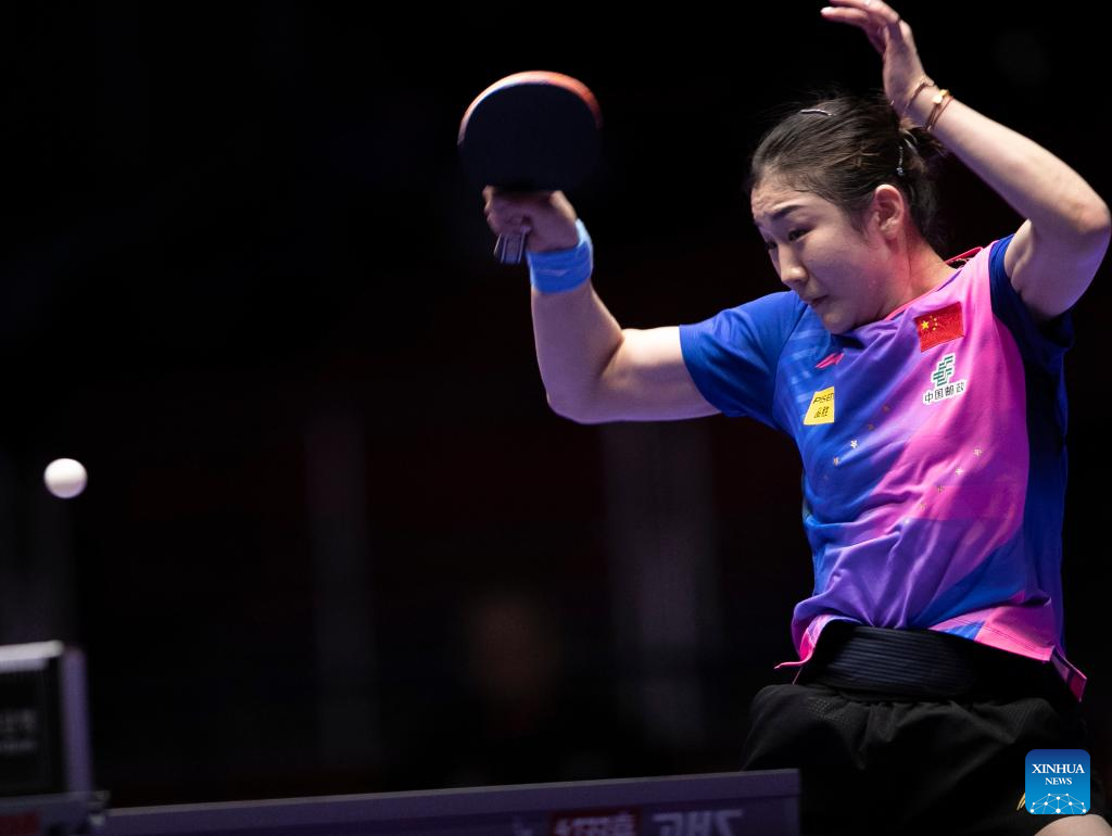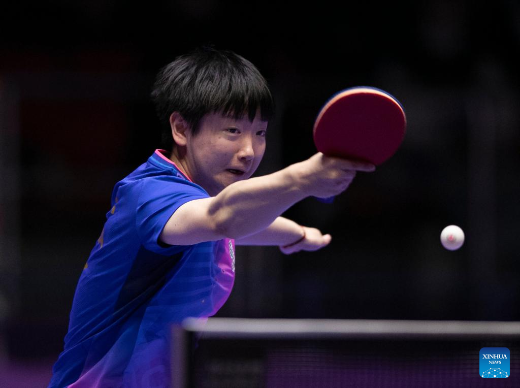 Sun Yingsha of China returns the ball to Maria Xiao of Spain during the women's team Group 1 match between China and Spain at the ITTF World Team Table Tennis Championships Finals Busan 2024 in Busan, South Korea, Feb. 18, 2024. (Xinhua/Yao Qilin)